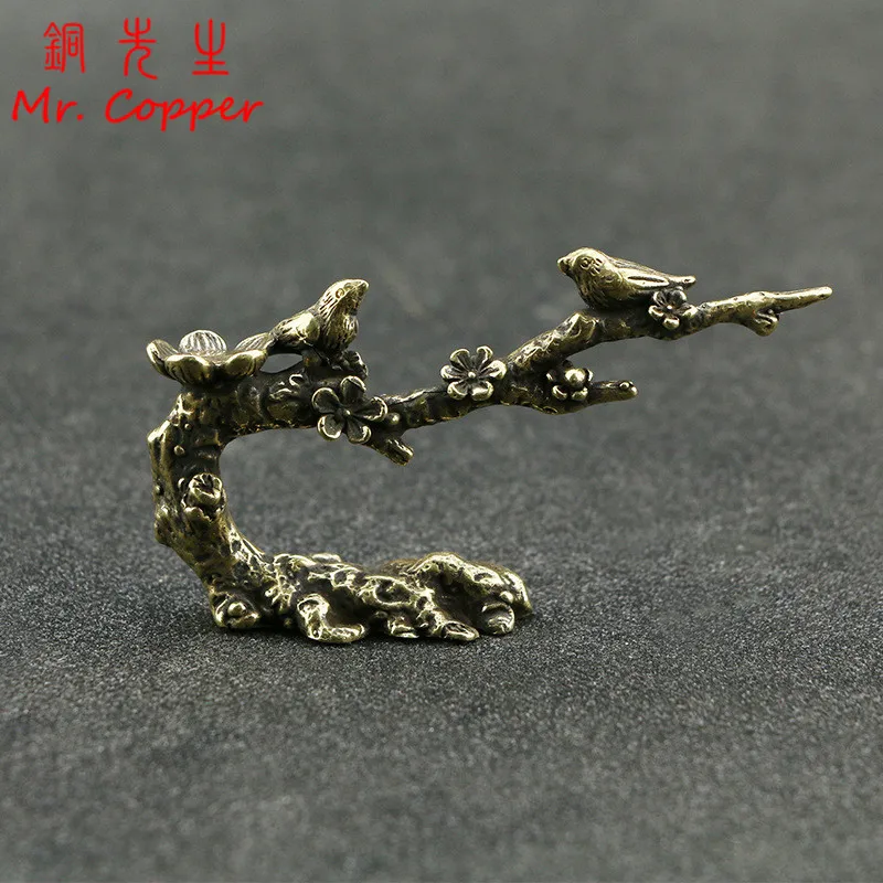 Sale Antique Copper Magpie Plum Blossom Pen Holder Small Ornaments Brass Bird Tree Figurines Home Decor